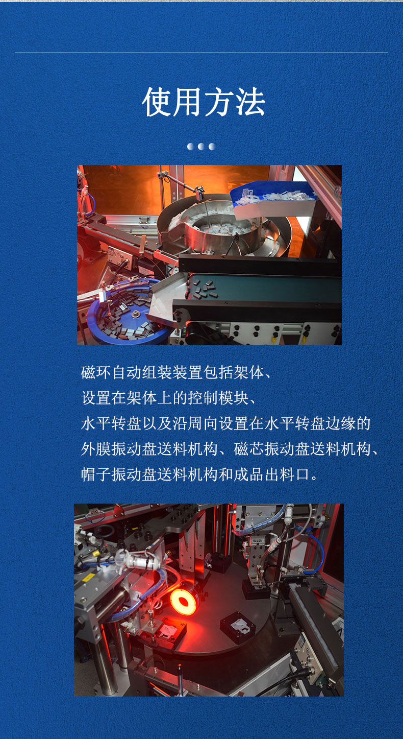 自动组装磁环。磁环自动组装装置包括架体、设置在架体上的控制模块、水平转盘以及沿周向设置在水平转盘边缘的外膜振动盘送料机构、磁芯振动盘送料机构、帽子振动盘送料机构和成品出料口。