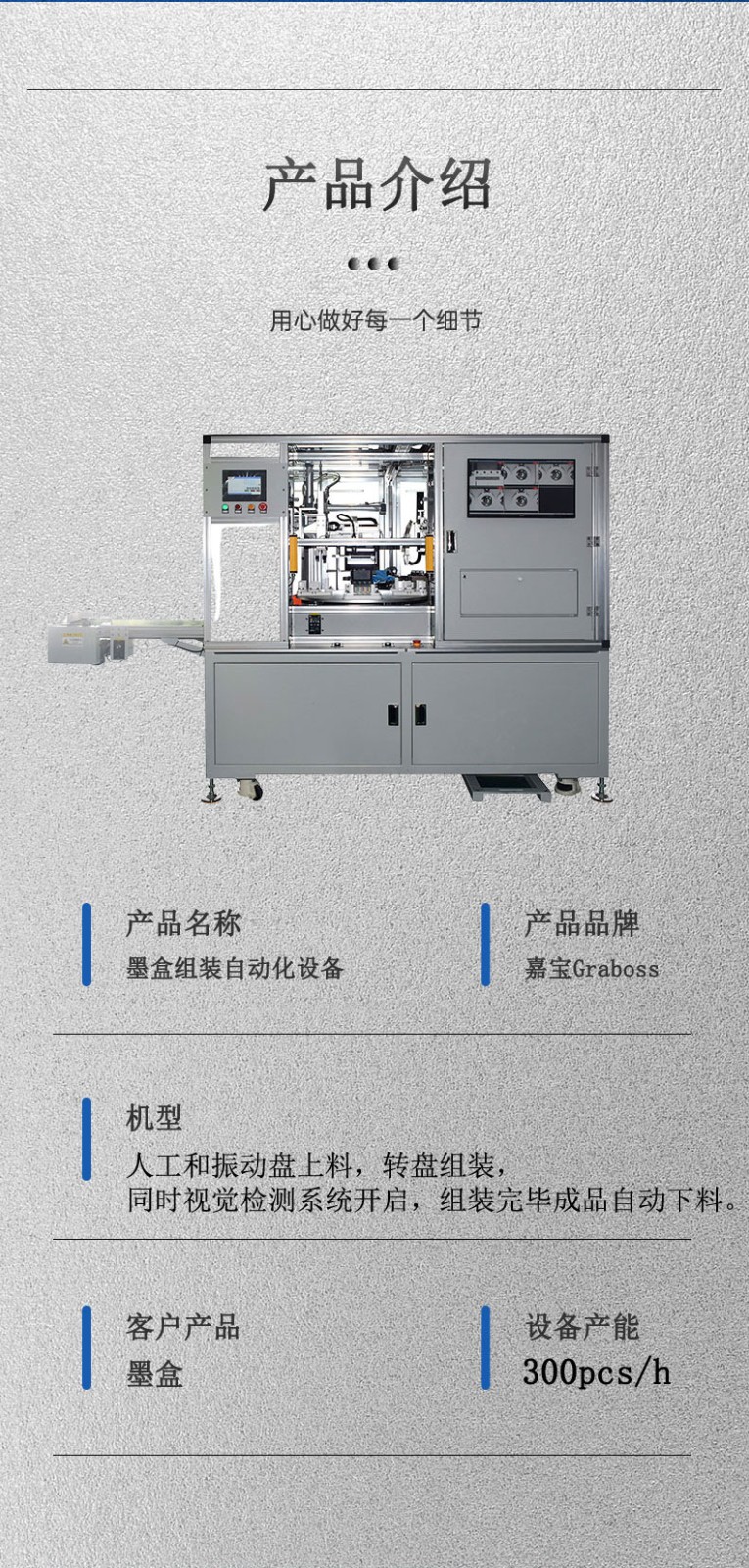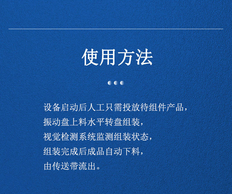 设备启动后人工只需投放待组件产品,振动盘上料水平转盘组装,视觉检测系统监测组装状态,组装完成后成品自动下料,由传送带流出。