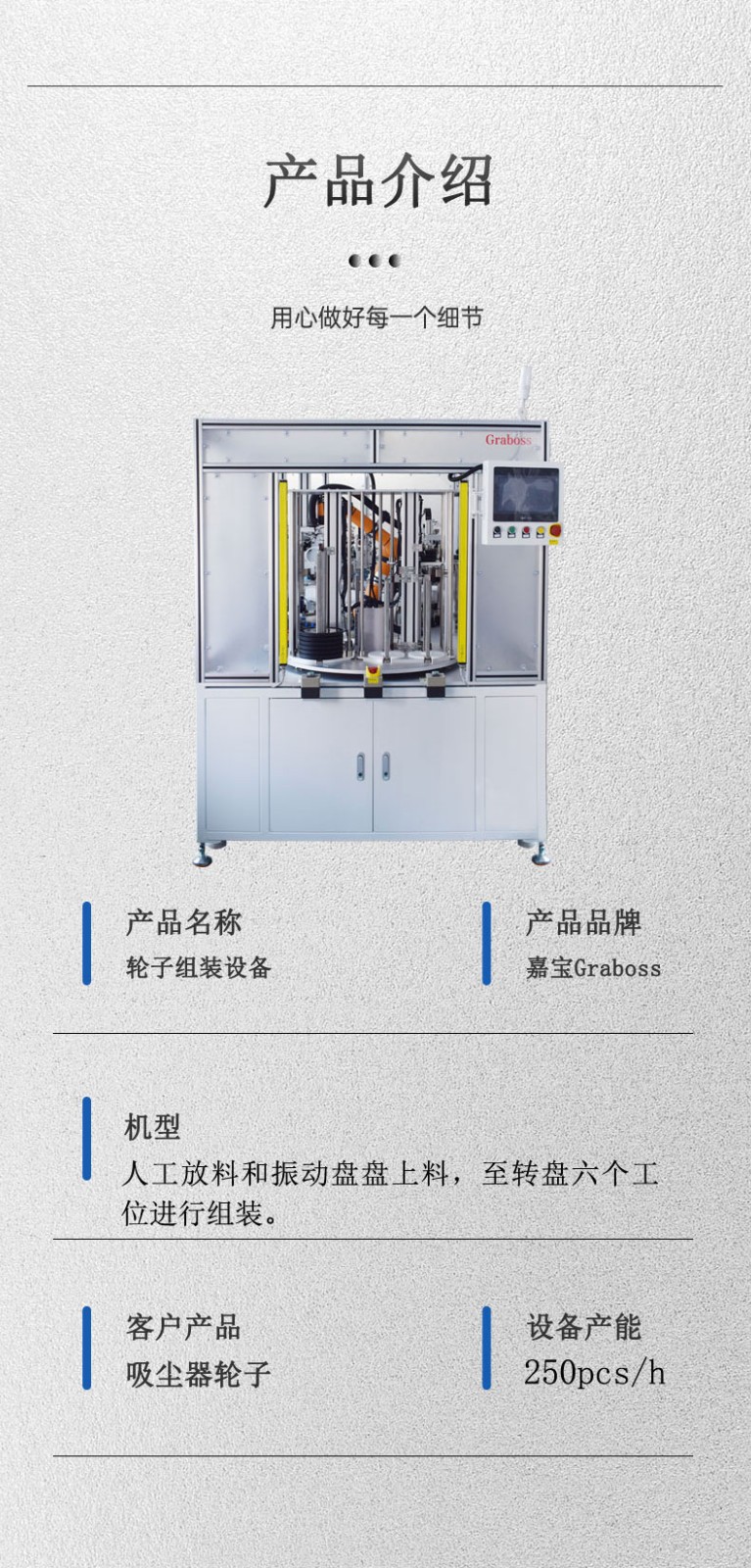 自动组装吸尘器轮子,人工上料+振动盘上料,机械手臂取料至转动盘按压组装,依次放入润滑油、振动盘传送的零件并组装,五个工位相继完成,由第六个工位吸盘带入传送带流出。