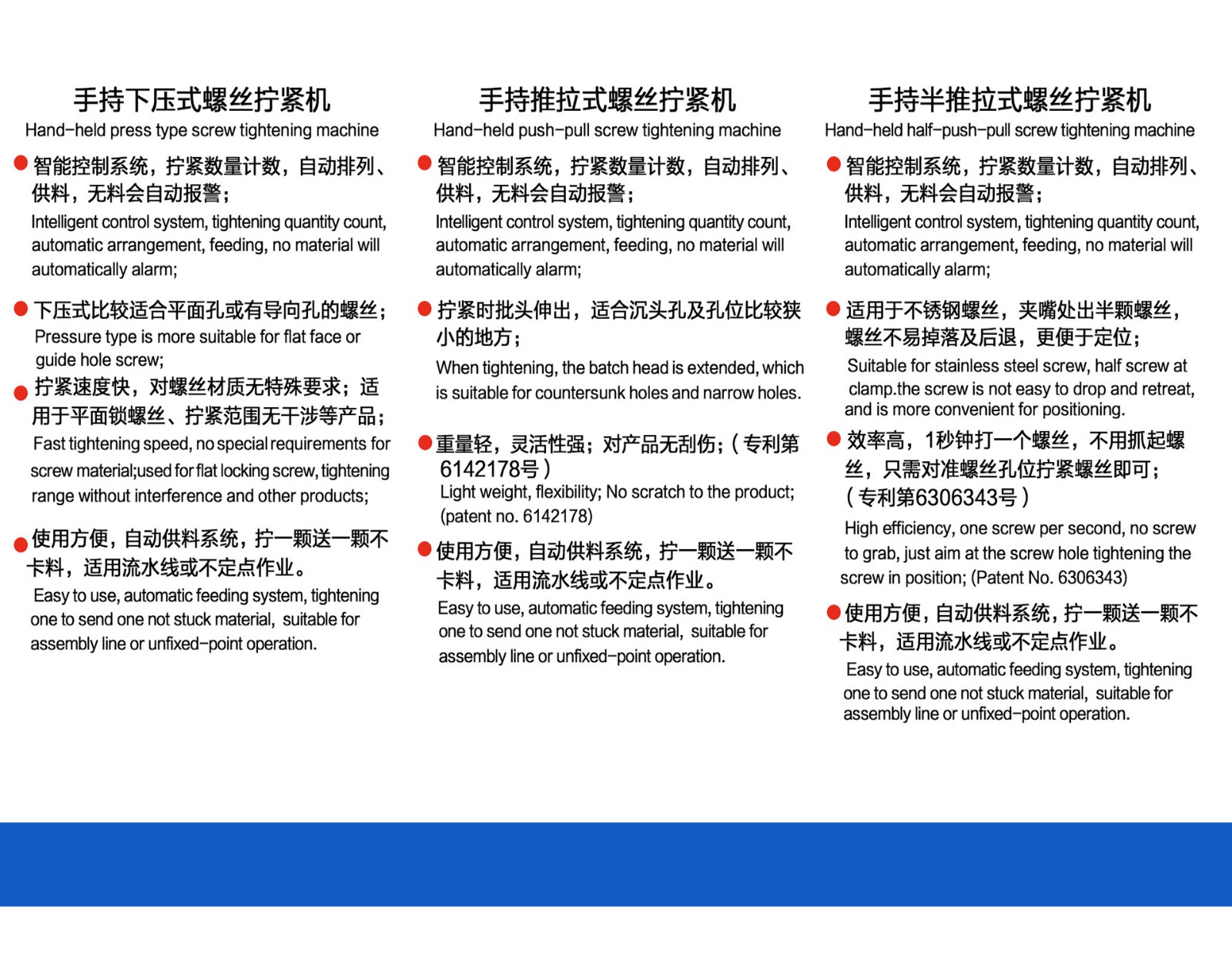 通用性强,使用方便,使用流水线或不定点作业。采用电磁感应信号送料控制,不会出现缺料或重复给料现象。大幅度提高螺丝锁付效率,智能缺料报警系统,0.3S完成送料。